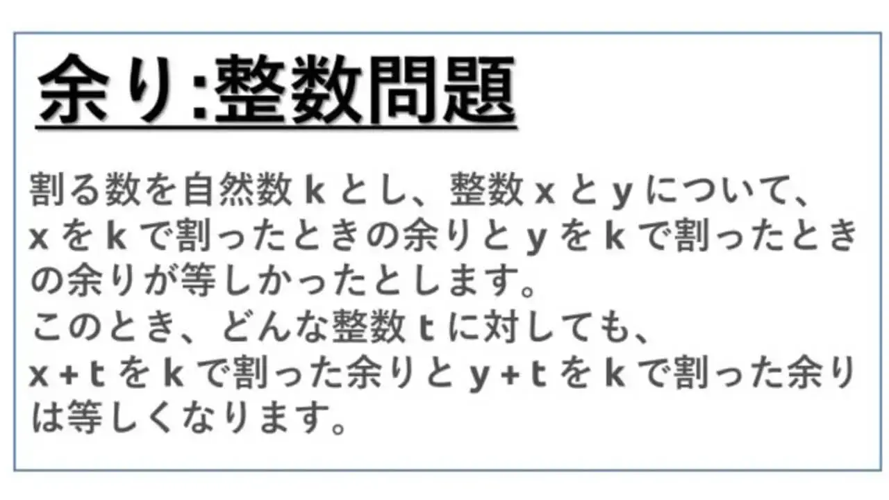余りが等しいということを直感的に考えると、よく分からない内容ですが、文字を用いて定式化して扱うと、すぐに証明ができてしまいます。