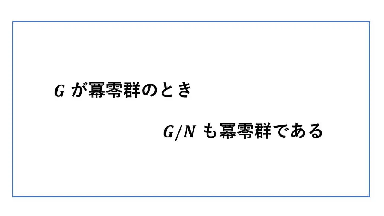 このことから、群 G が冪零だと、Gの降中心列が有限の長さで単位群となることから、剰余群 G/N の降中心列も有限の長さで単位群となります。