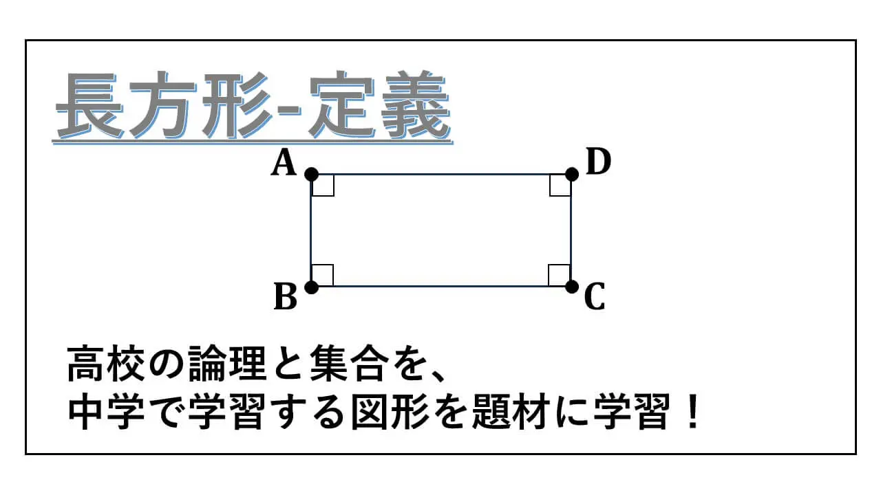 長方形 – 定義 「4つの内角が全て直角である四角形」ということと、2本の対角線の長さが等しいことについての考察を通じて、命題の反例とは何かということを解説しています。