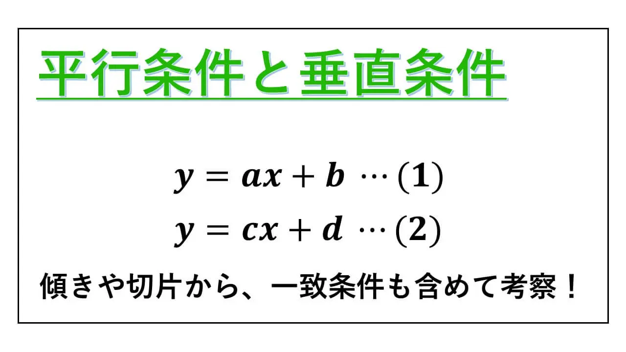 平行条件と垂直条件 :直線の傾きと切片の話【一致条件と無限個の解も】