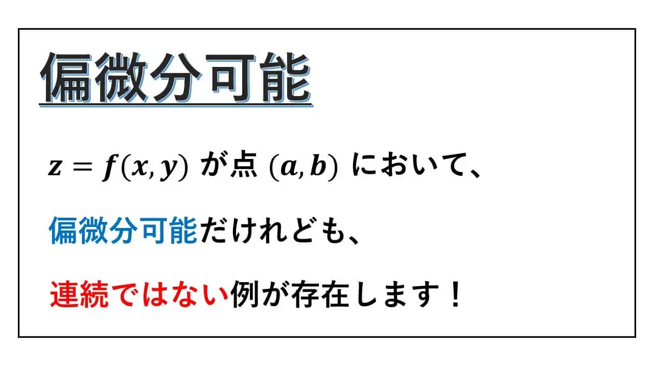 この等しいという関係に注意しつつ、偏微分可能だけれども連続ではない例について説明します。