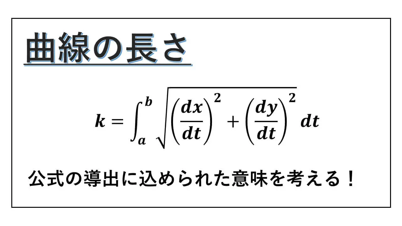 " 曲線の長さ “の公式を定義から" 導出 “するときに、微小変化からの積分イメージを解説しています。