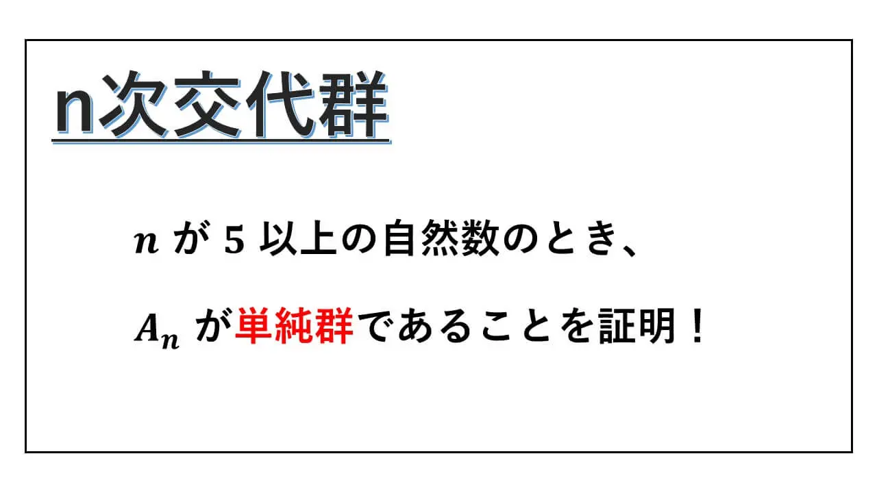 そのため、n ≧ 5 のとき、An の単位群ではない任意の正規部分群が長さ 3 の巡回置換をすべて含むということを示すと、An が単純群ということを示したことになります。