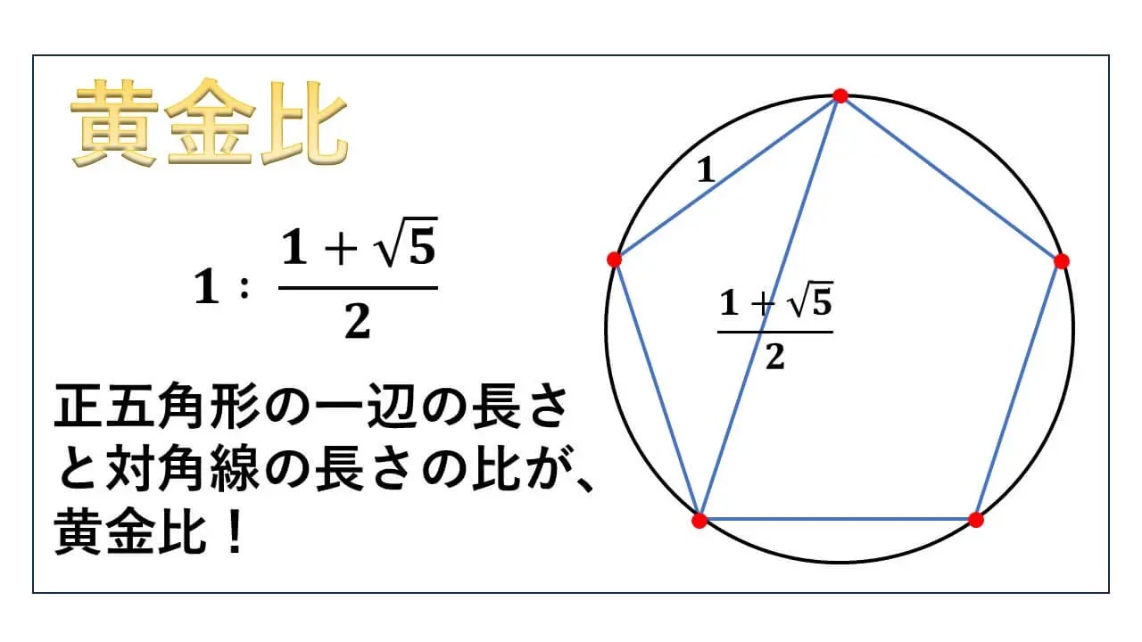 正五角形の一辺の長さと対角線の長さの比が" 黄金比 “となっていることを解説します。
