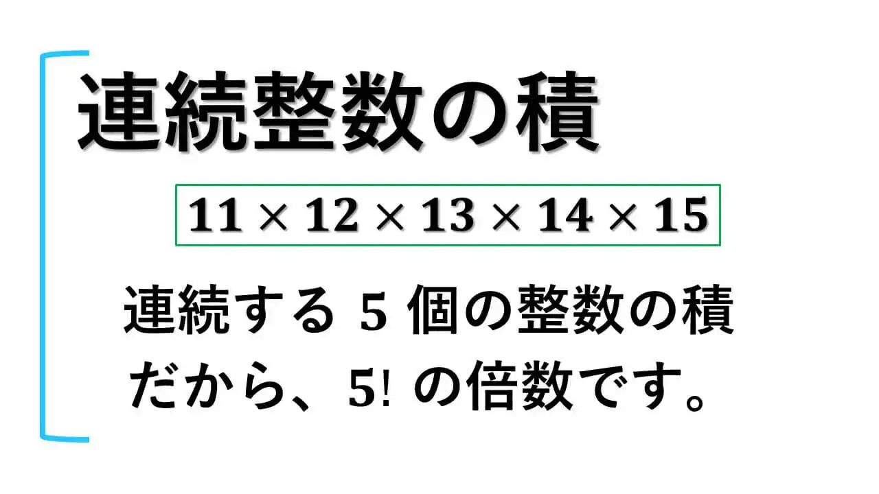 " 連続整数の積 " とは、n 個の連続する整数をすべて掛け合わせると n! の倍数となるということを表しています(この n は自然数です)。
