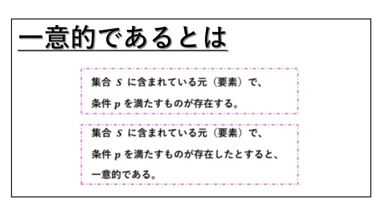 大学で使うような数学の本を見ると「一意である」ということが、とてもよく書かれています。そのため、早い段階で押さえておくと良いかと思います。